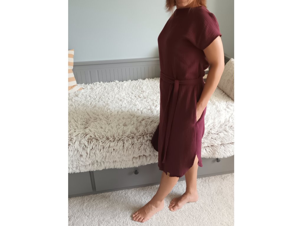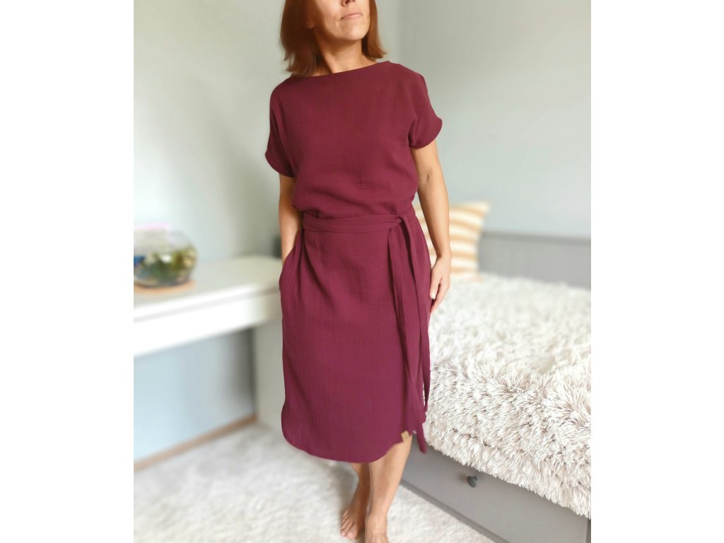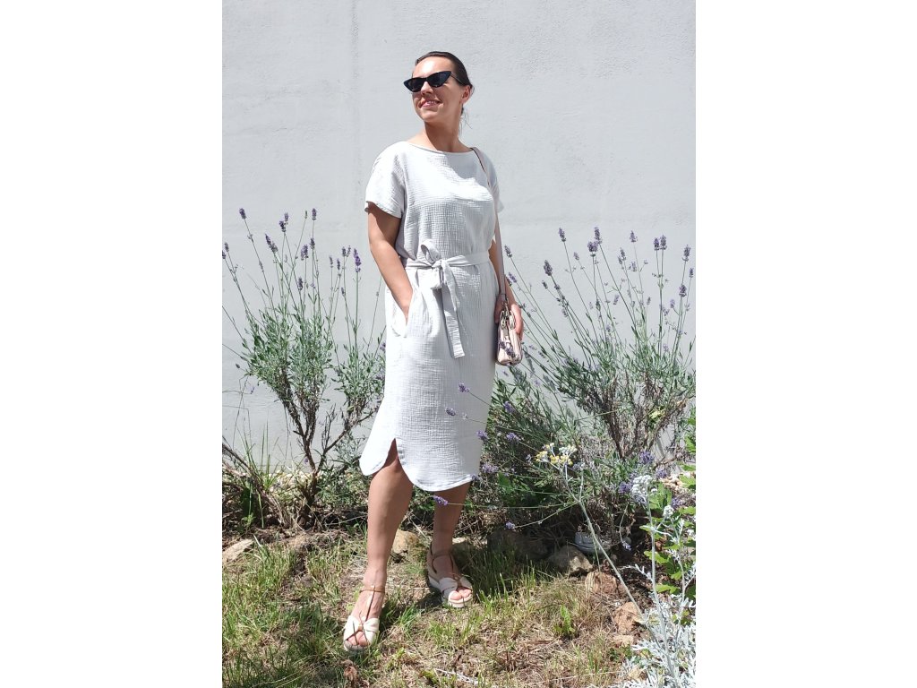 Jednoduché šaty z dvojitého mušelínu/gázoviny, což je jemná, lehká, vzdušná tkanina, příjemná na tělo, 100% bavlna. Prodyšná a jednoduchá na údržbu. Má jemně pomačkanou strukturu a pere se na 30 st. Nemusí se žehlit.