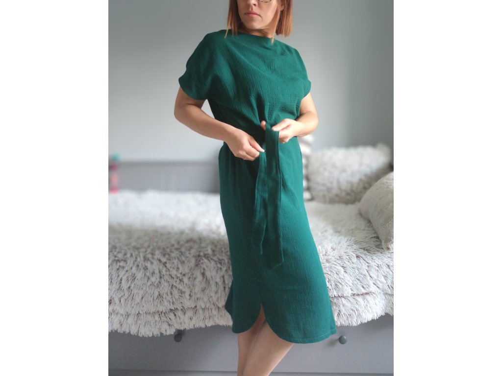 Šaty jsou volnějšího střihu s přinechaným rukávem, hezky se tvarují na ramenech. Po stranách ve švech mají kapsy. Délka je cca 105 cm, po stranách rozparky do kulata. Šijeme velikost na přání, lze upravit i délku. Šaty se moc příjemně nosí. K šatům patří delší opasek na stažení.
