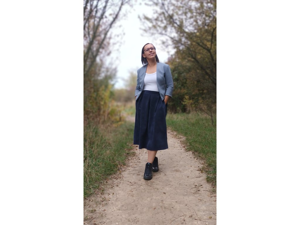 Délka sukni šijeme na v délce 70 cm, na přání můžeme délku upravit. Sukně má ve předu tři sklady, zadní díl je do gumičky- pás je proto pružný a přizpůsobí se postavě.